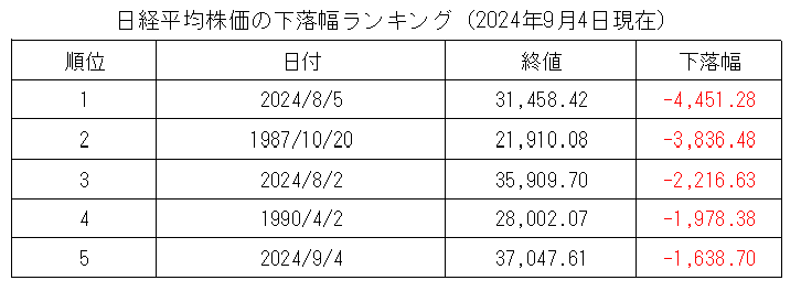 日経平均、ここ一ヶ月間に歴代5番目までの下げ幅が3回