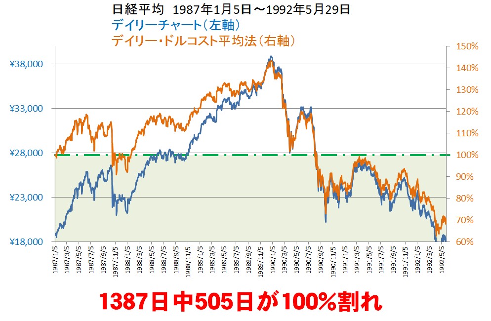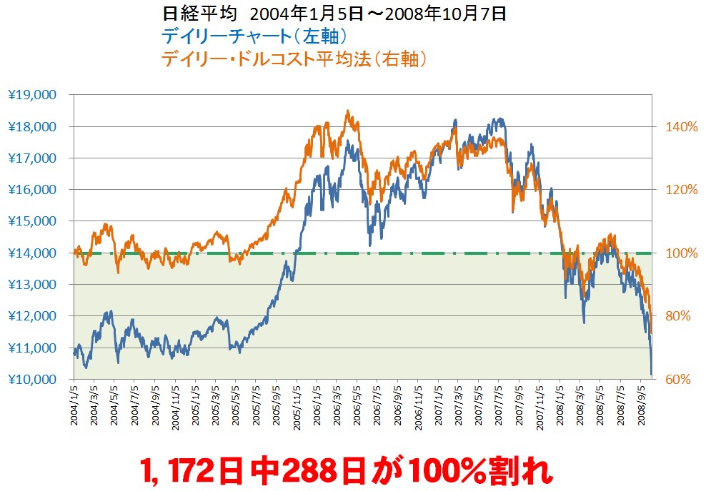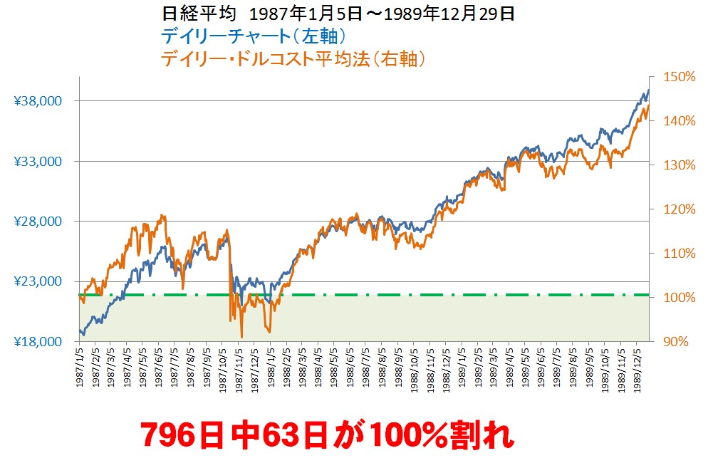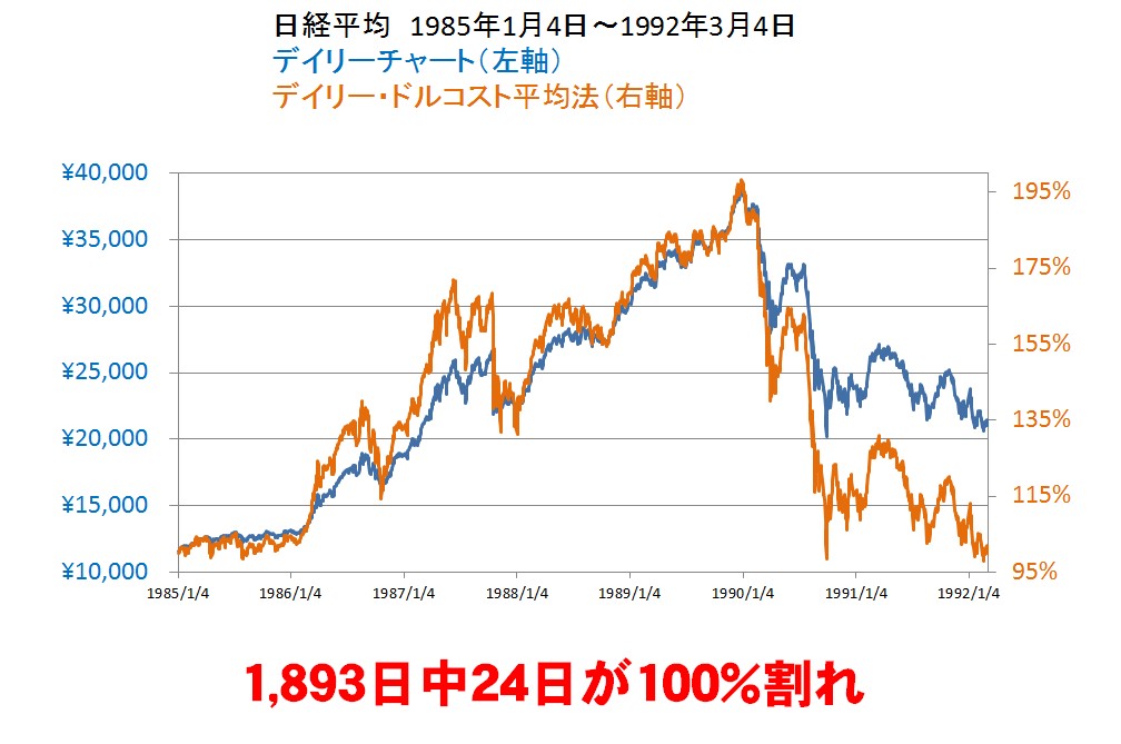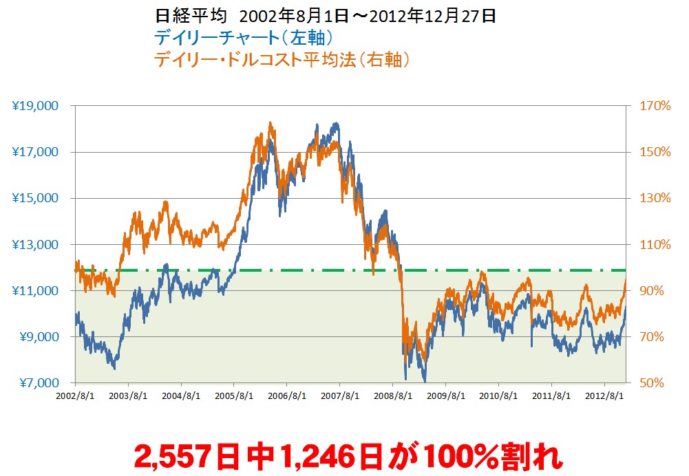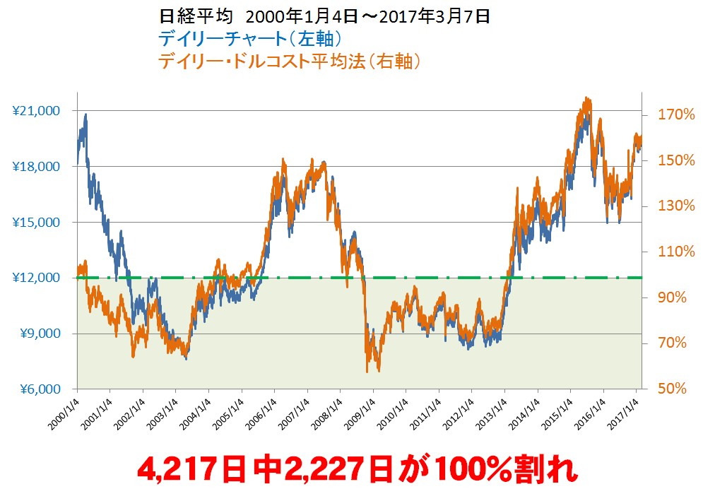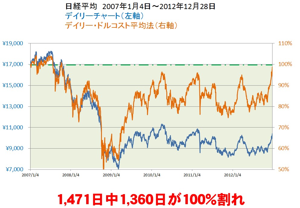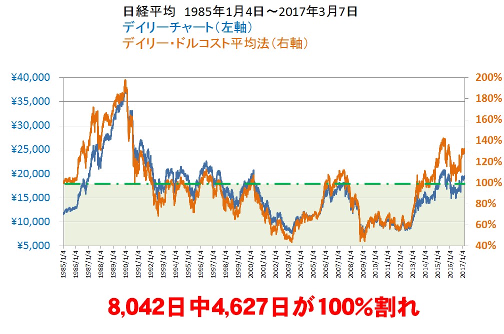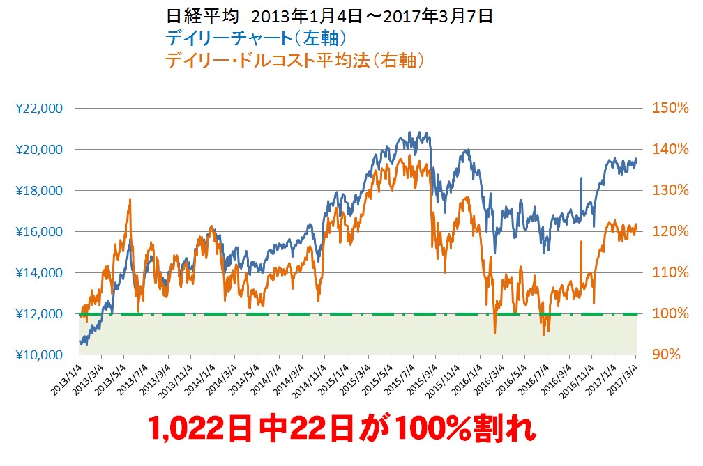 以下、平均株価指数を使って、ドルコスト平均法(毎日)でどのような結果になってきたのかを見ていきましょう。