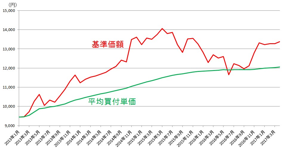 2013年1月~2017年4月(4年4か月)、某投資信託(上と同じ)に対して積立投資を行った際の「基準価額」(赤)と「平均買付単価」(緑)の推移です。