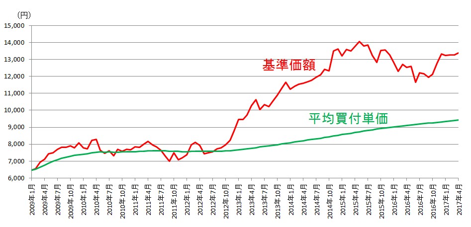 2009年1月~2017年4月(8年4か月)、某投資信託に対して積立投資を行った際の「基準価額」(赤)と「平均買付単価」(緑)の推移です。