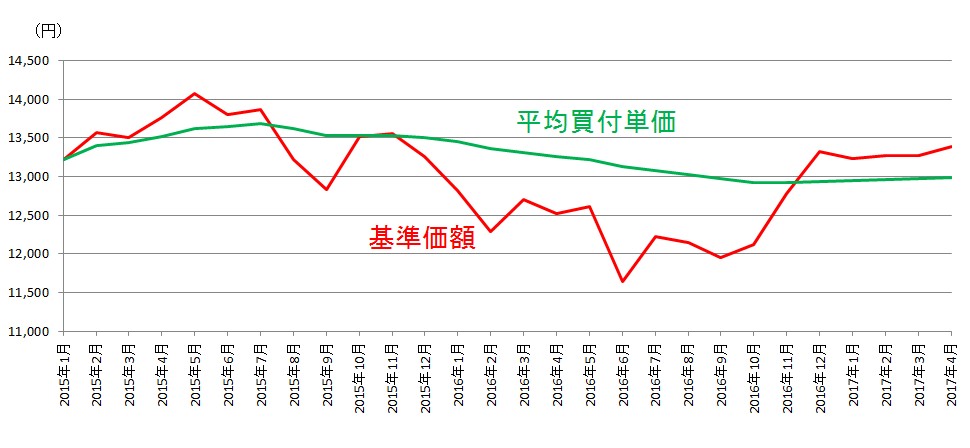 2015年1月~2017年4月(2年4か月)、某投資信託(上と同じ)に対して積立投資を行った際の「基準価額」(赤)と「平均買付単価」(緑)の推移です。