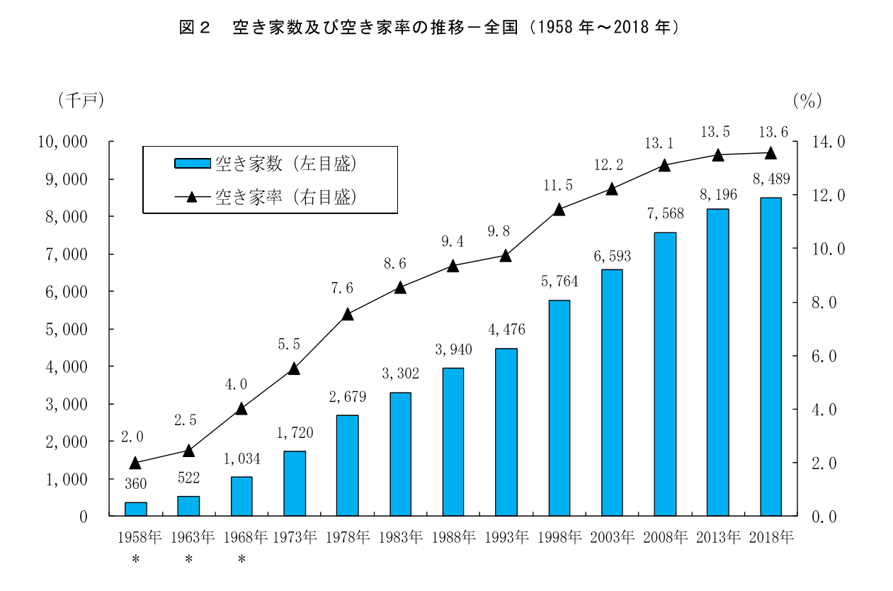 総務省の2013年「住宅・土地統計調査」(速報集計)によりますと、1988年の空き家の数は394万戸だったものが、2013年には819.6万戸(内、マンションは45%)になり、2018年の調査では848万9千戸と2013年と比べ、29万3千戸増となっています。また,総住宅数に占める空き家の割合(空き家率)は13.6%と2013年から0.1ポイント上昇し、過去最高となっています。