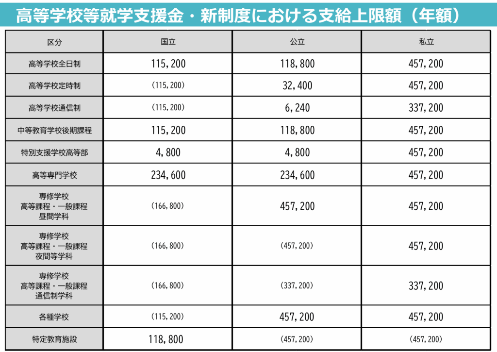 2026年4月、親の年収に関わらず、すべての高校生が支援を受けられるようになりました。 公立の場合、授業料は完全の0円になります。 私立の場合、457,200円を超える分の授業料は自己負担となります。 以前より無償化をはじめていた大阪府は独自の補助があり0円です。 大阪以外の地域でも独自に補助をしている自治体もあるので、確認されてください。